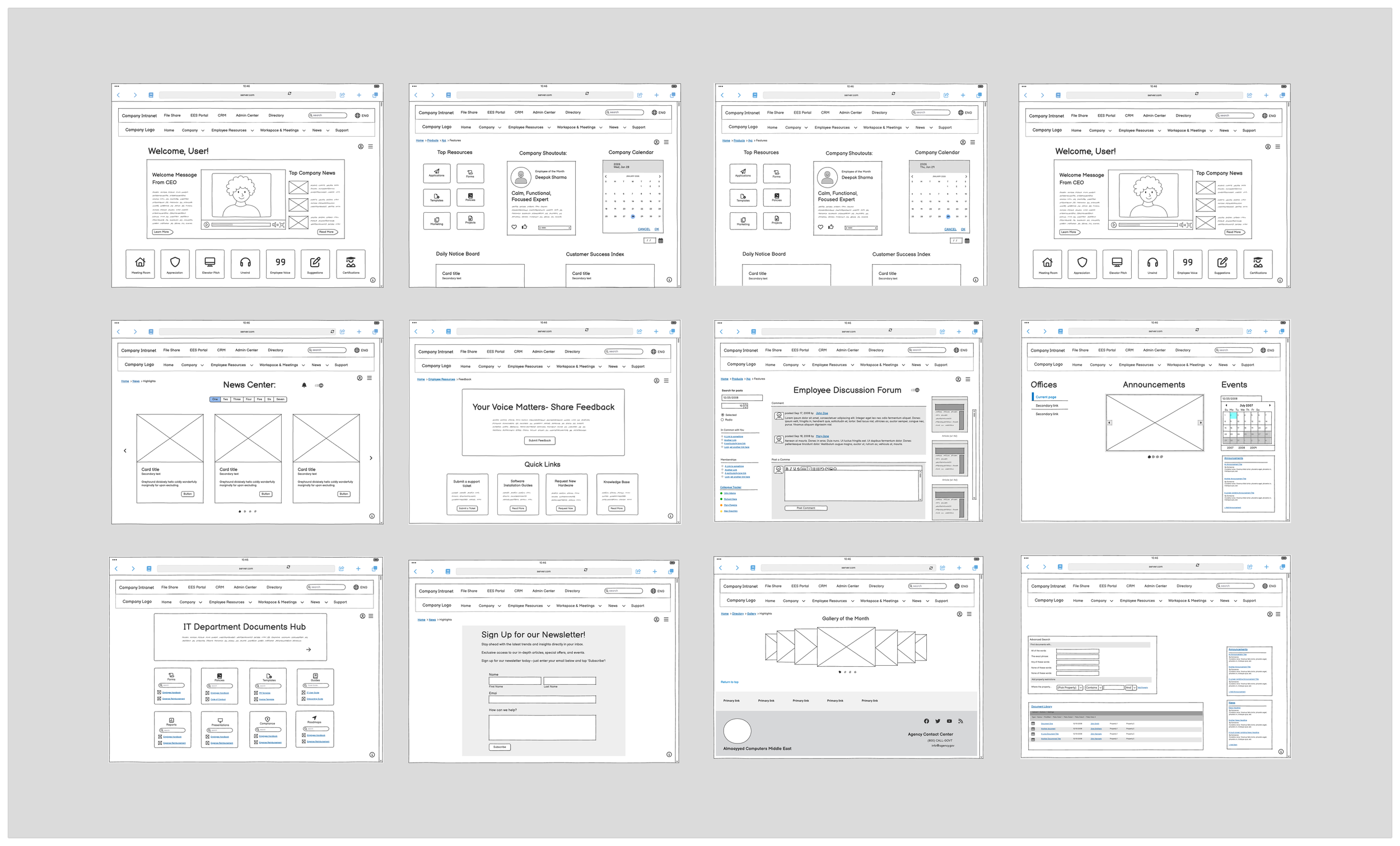 Mapped critical user journeys including employee onboarding, policy lookup, department directory navigation, and resource requests. These flows revealed pain points and opportunities for streamlining interactions, which directly informed wireframe development.