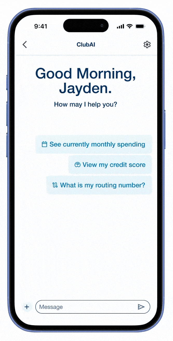 The ClubAI chatbot interface helps users get financial advice, analyze their financial data, and also get their banking information, like their monthly transaction history.